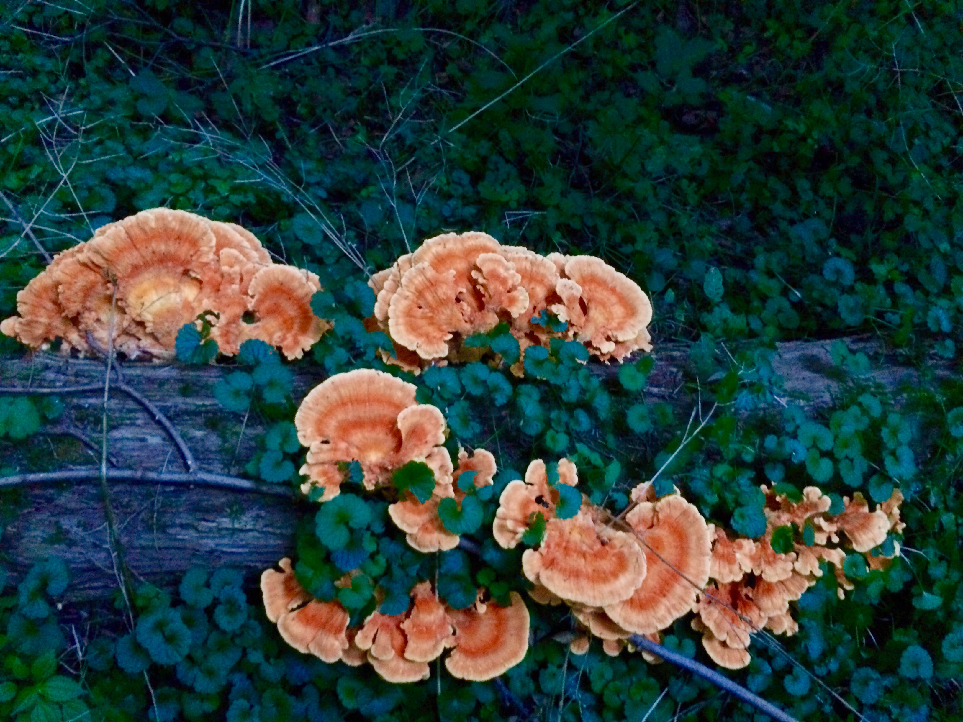 These are their actual colors! The bright orange and yellow, and sometimes even a light reddish hue with white edges, stand out among the green of the forest. The young ones are the best. They are soft and tender and yep… they taste like chicken. The mushrooms become woody as they grow larger so if you find smaller ones pick them while you can.